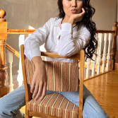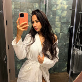 My dark brown hair and warm brown eyes create a deep, calm presence.